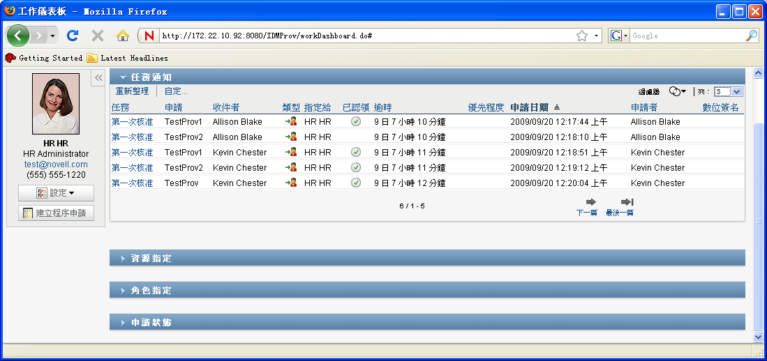 依預設,在您登入 Identity Manager 使用者介面後,「工作儀表板」索引標籤即會開啟︰
