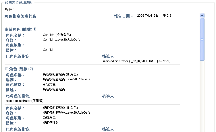 針對角色指定、使用者指定及 SoD 證明程序,此表單包含一份顯示需要您檢閱之資料的報告: