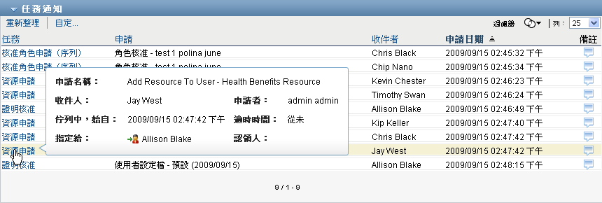 若「」控制項中未選取任何選項,則任務清單會顯示目前使用者的任務。包括使用者是收件者或收件人的任務,以及收件者或收件人是目前使用者所屬群組、容器或角色的任務。佈建管理員或佈建主管可以對自己的任務執行任何動作,因為處理自己的任務不需要具備任何權限。