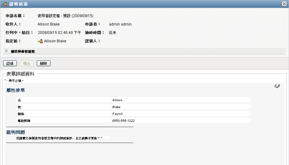 認領了與證明申請相關聯的某項任務之後,您需要檢閱證明表單中顯示的資訊。此外,您需要回答必要的證明問題,以證明資料的正確性,而在某些情況下,您將需要回應一或多個調查問題。針對使用者設定檔證明程序,此表單包含您需要驗證其正確性的使用者屬性資料。針對角色指定、使用者指定以及 SoD 證明程序,此表單包含一份顯示您需要驗證之角色指定、使用者指定或 SoD 資料的報告。