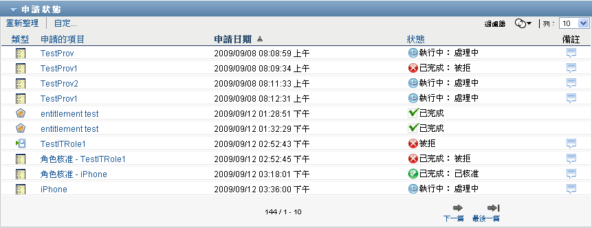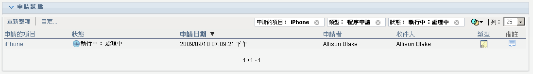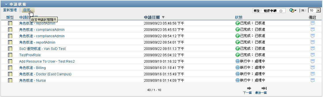附註:如果角色服務驅動程式所在伺服器的系統時鐘與執行使用者應用程式之伺服器的系統時鐘不同步,則「申請狀態」清單與「角色指定」清單上的申請狀態可能會不相同。例如,如果您申請不需要核准的角色指定,「申請狀態」區段中顯示的狀態可能是「已提供」,而「角色指定」區段中顯示的狀態則是「待處理的啟動」。如果您等待一分鐘左右,可能就會看到「角色指定」區段中的狀態變更為「已提供」。若要確定「使用者應用程式」上的狀態可正確顯示,請檢查系統時鐘,確定它們適當同步。