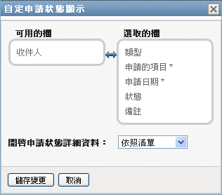 「」和「」欄都是必要欄,無法從申請清單顯示畫面中移除。