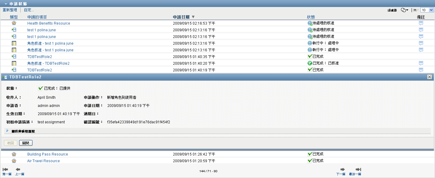 若選取了某個角色,清單會顯示將所選角色做為收件者的申請。