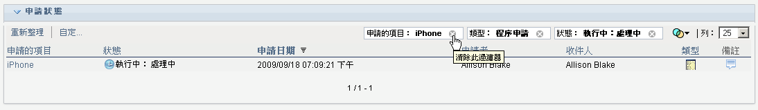申請清單即會更新,反映出目前使用者申請清單的目前狀態。按一下「」按鈕不會移除任何一個已套用至申請清單的過濾器。重新整理申請清單時,已定義的所有過濾器都會用於更新清單,在您重設這些過濾器之前,他們將一直有效。