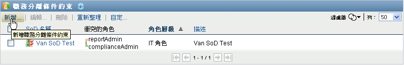 使用者應用程式會顯示該目錄中目前定義的職務分離條件約束清單。