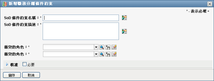 如果 SoD 條件約束需要對例外核准,請選取此方塊。 如果 SoD 條件約束不需要對例外核准,請不選此方塊。 |