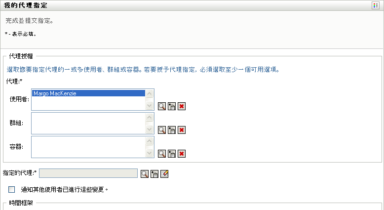 附註:在您變更代理指定的許可後,使用者應用程式不會將您從代理模式登出。如此,若您設定有誤,還可以對值進行變更。因此,若您在代理模式下刪除代理指定,您在移除代理指定後仍然能夠編輯代理指定並處理代理使用者的任務。
