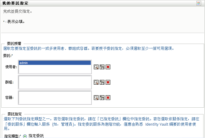 如果您是「提供應用程式管理員」,則使用者應用程式會提供下列介面供您定義委託指定: