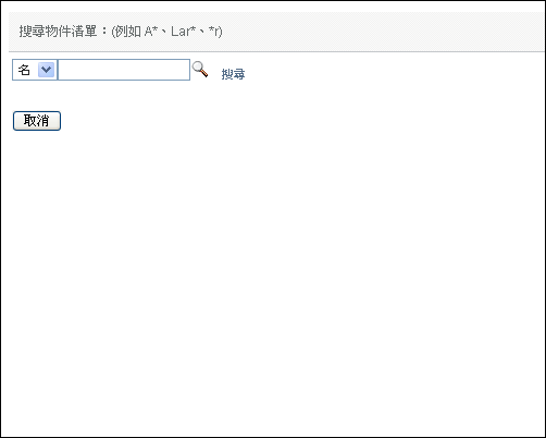 物件選擇器。 提供「搜尋」對話方塊和快顯方塊的存取途徑。可以根據您在「使用者應用程式」中的位置為不同類型的物件輸入搜尋準則。例如,在「身分自助服務」索引標籤中,可以搜尋使用者和群組,而在「角色」索引標籤中,可以搜尋使用者、群組和角色。