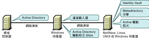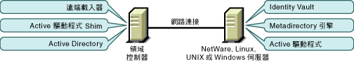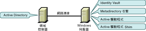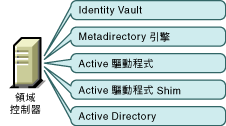 單一 Windows 領域控制器可以代管 Identity Vault、Metadirectory 引擎和驅動程式。