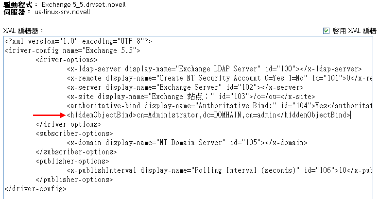 在 <driver-options> 區段中,新增指定自定結合的標籤和字串。