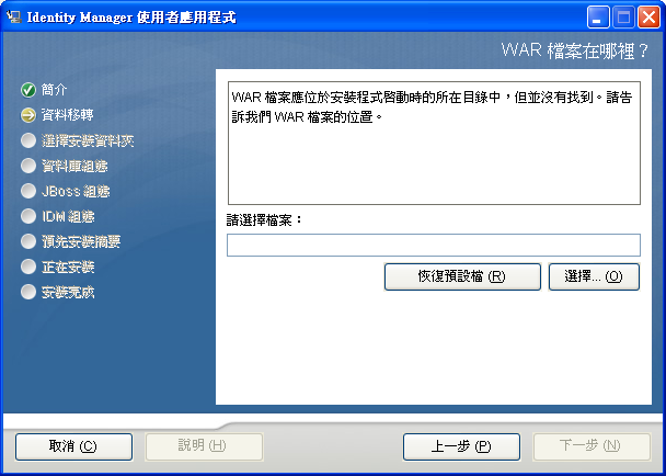 如果「Identity Manager 使用者應用程式」的 WAR 檔案所在的目錄與安裝程式的不同,安裝程式就會提示您輸入 WAR 的路徑。