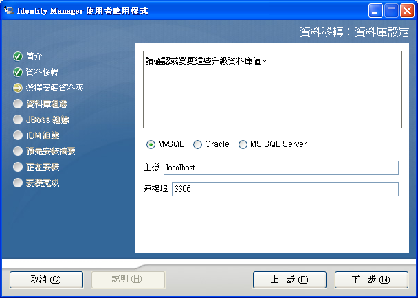 系統會要求您確認資料庫類型、主機名稱和連接埠。提供這些資訊,然後按「」。