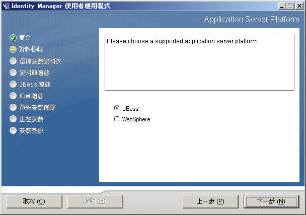 選擇 JBoss 應用程式伺服器平台,然後按一下「