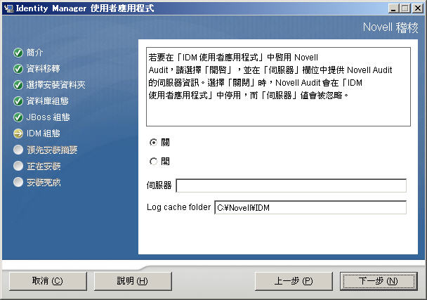 如需設定 Novell Audit 記錄的相關資訊,請參閱《Identity Manager 使用者應用程式:管理指南》。