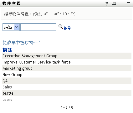 若「」選項方塊是空的,則按一下「」圖示可開啟「物件查閱」視窗。指定小組成員的搜尋準則,按一下「」並選取小組成員。