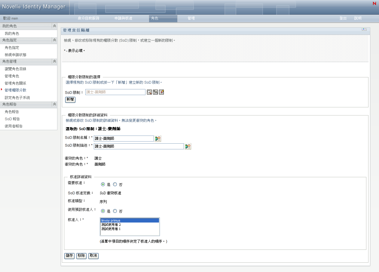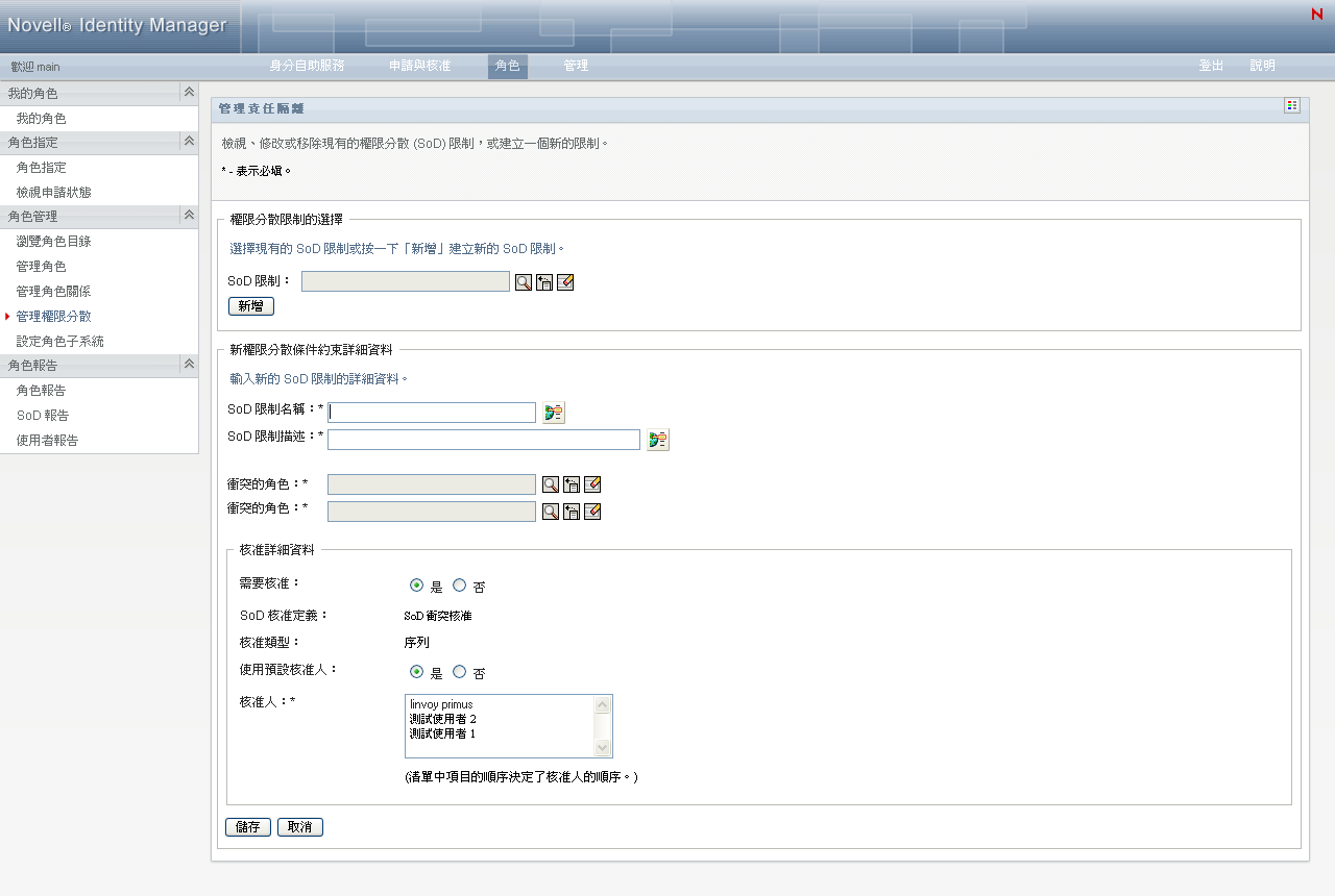 頁面存取 角色管理員或安全官可以存取「管理權限分散」頁面。安全官需要擁有對 Identity Vault 中 SoDDef 容器的瀏覽權限,但不需要對角色的瀏覽權限。