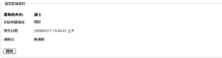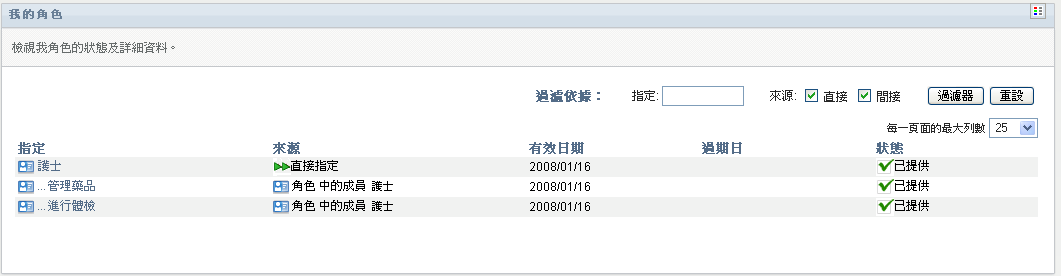 「使用者應用程式」將顯示目前經過認證的使用者其角色指定的目前狀態。