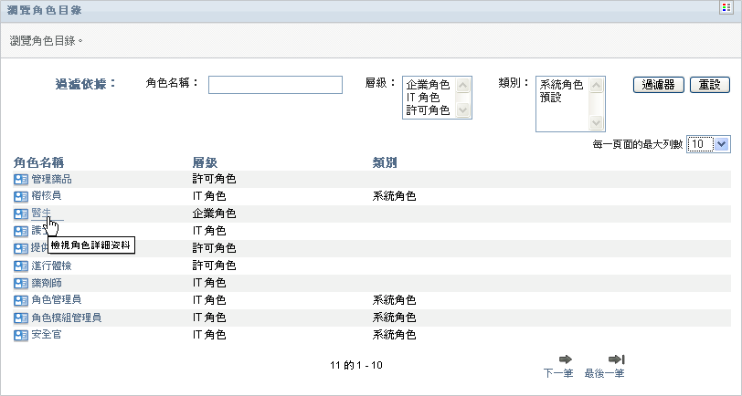 若要檢視特定角色的詳細資料,請在「」欄中按一下該角色名稱。