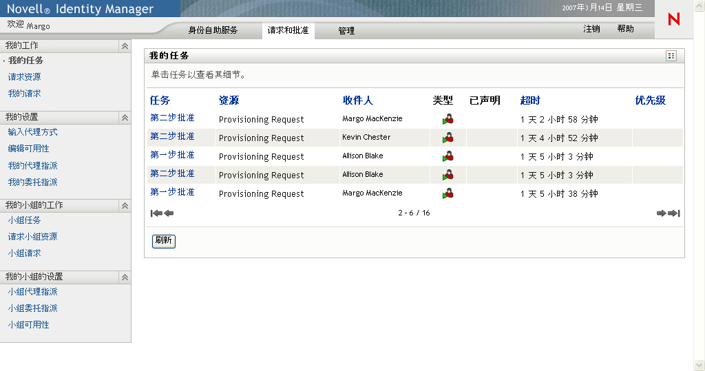 依預設,登入 Identity Manager 使用者介面後,「申請與核准」標籤會開啟並顯示「我的任務」頁面: