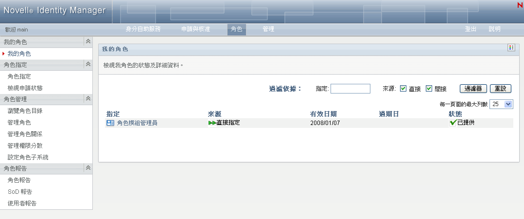 依預設,「角色」索引標籤將會開啟並顯示「我的角色」頁面。