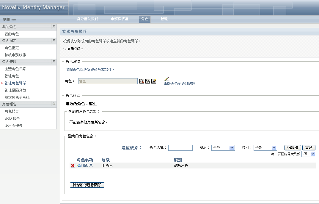 中間層級角色 (IT 角色) 可包含較低層級角色,並且可為較高層級角色所包含。「角色關係」頁面將允許您新增「新的較低層級角色」和「新的較高層級角色」。