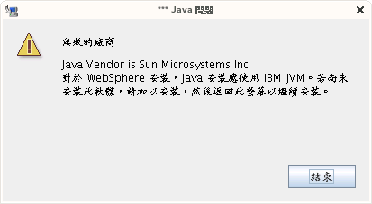 附註:若是 WebSphere 6.1,安裝程序需要 IBM 的 Java 2 Platform Standard Edition 開發套件 1.5 版 JDK。若是 WebSphere 7.0,安裝程序需要 IBM 的 1.6 版 JDK。如果使用其他版本,安裝程序將無法成功設定使用者應用程式 WAR 檔案。安裝會顯示成功,但是當您嘗試啟動「使用者應用程式」時會發生錯誤。