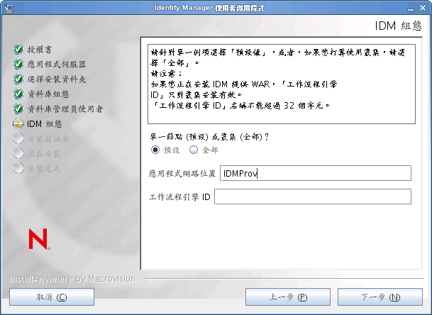 :應用程式伺服器組態的名稱、應用程式 WAR 檔案的名稱,以及 URL 網路位置的名稱。安裝程序檔會建立一個伺服器組態,並會依預設根據「」來命名組態。請將應用程式名稱記錄下來,當您從瀏覽器啟動「使用者應用程式」時,請在 URL 中輸入這個名稱。