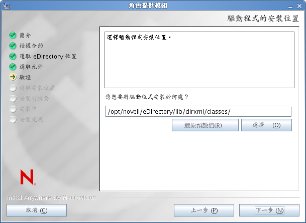 如果使用者身分證明有效,並且使用者具備適當的權限,則安裝程式會顯示「驅動程式組態檔案的安裝位置」螢幕: