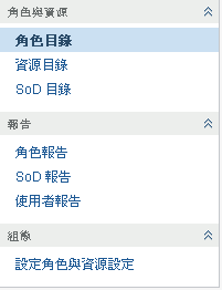 「角色與資源」索引標籤的左側顯示您可以執行的動作功能表。這些動作按類別 (「角色與資源」、「報告」及「組態」) 列出: