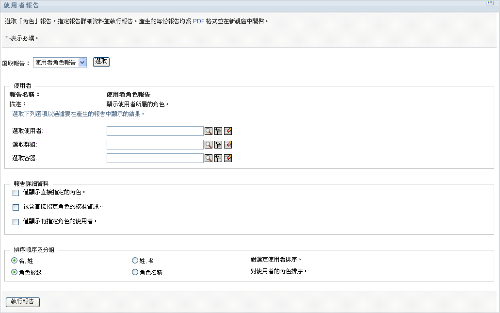 「使用者角色報告」顯示的內容包括: