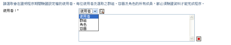 請注意,「」欄位的文字是唯讀的。在使用者設定檔證明程序中,證明者是「」欄位中選定的使用者,以及您在「」欄位中新增的任何群組、角色及容器中的所有成員。這是因為每個使用者必須是他或她自己設定檔的證明者;其他使用者不能當證明者。
