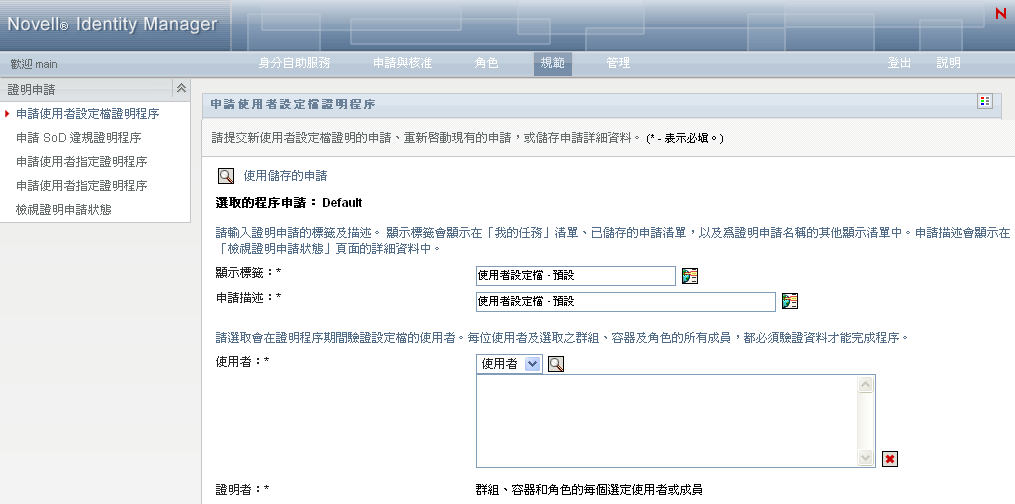 依預設,「法規遵循」索引標籤會顯示「申請使用者設定檔證明程序」頁面。