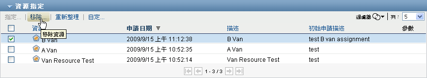若「」控制項中未選取任何選項,則資源指定清單會顯示目前使用者的資源指定。包括使用者是收件者或收件人的資源指定,以及收件者或收件人是目前使用者所屬群組、容器或角色的資源。使用者可以對自己的資源指定執行任何動作,因為處理自己的資源不需要具備任何權限。