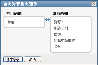 儀表板的「」區段可讓您選取和不選某些欄,還可以將任務清單顯示畫面中的欄重新排序。欄的選擇與排序由「自定資源指定顯示」對話方塊內的設定控制。當您修改欄清單或對欄重新排序後,該自定設定會和您的其他使用者優先設定一起儲存在 Identity Vault 中。