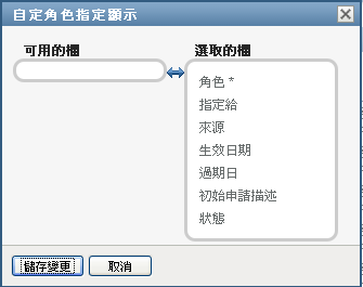儀表板的「」區段可讓您選取和不選某些欄,還可以將任務清單顯示畫面中的欄重新排序。欄的選擇與排序由「自定角色指定顯示」對話方塊內的設定控制。當您修改欄清單或對欄重新排序後,該自定設定會和您的其他使用者優先設定一起儲存在 Identity Vault 中。