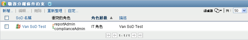 使用者應用程式會顯示該目錄中目前定義的職務分離條件約束清單。
