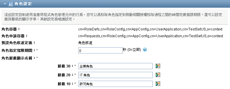定義角色層級的顯示名稱。每個層級都有單獨的顯示名稱,可以翻譯為多種語言。若要提供外語字串,請按一下「」。