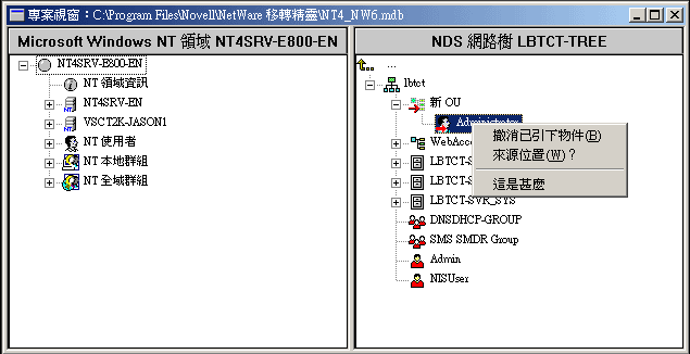 撤消放下的物件---若要使放下的物件返回其原來的位置,請用滑鼠右鍵按一下 NT 領域或目的 NDS 網路樹中所放下的 NT 物件,然後按一下「撤消放下的物件」。