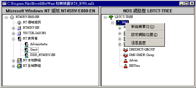您可以在 NDS 網路樹中建立新的 NDS OU,然後將 NT 資訊移轉至那些 OU 中。這可組織化 NT 資訊並保留在 NDS 網路樹中的某個位置上。您也可以選擇將 NT 資料移轉至現有的 OU 中;您只需記得您一直可以在 NDS 網路樹中建立新的 OU。