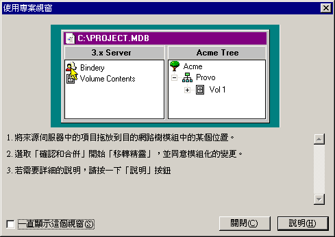 您大部分的工作是在「專案視窗」中進行,您可以在此將 NetWare 3 集結物件和卷冊資料拖放到目的 NDS 網路樹的 NDS 容器內。