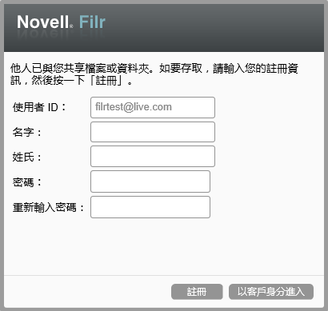 然後使用者必須在 Filr 網站上註冊才能登入 (在 Filr 1.1 以前的版本,使用者可使用其 Google 或 Yahoo 帳戶登入 Filr 站台。此功能不再提供給 Filr 1.1 和更新版本中新的 Filr 使用者使用。如需此變更的詳細資訊,請參閱《Novell Filr 1.1 讀我檔案》。)