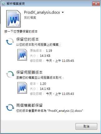 保留兩個檔案: 在 Filr 伺服器上的檔案另存為原始檔案,您的檔案版本會重新命名。