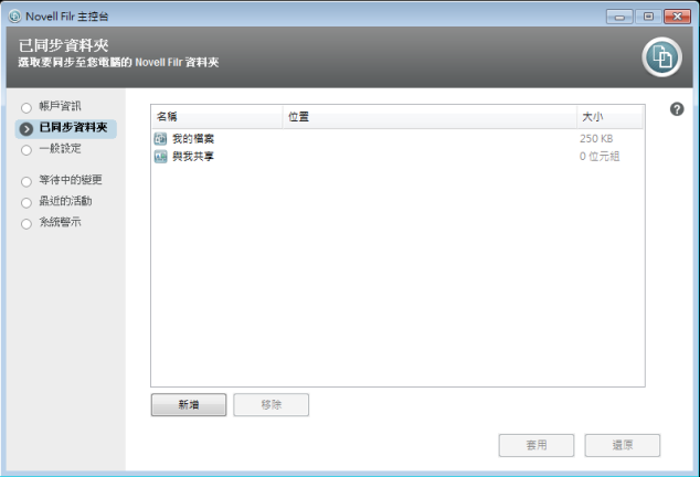 您在第一次設定 Filr 桌面應用程式時,可選擇需要同步的資料夾。依預設,系統會同步「我的檔案」和「與我共享」;您必須手動設定「網路資料夾」才能同步。在進行初始組態期間或是完成初始組態後的任何時間,您都可設定要同步的資料夾。