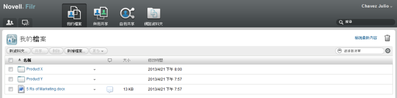 當您第一次使用網頁瀏覽器啟動 Novell Filr 時,則會顯示「我的檔案」頁面。您可管理在此頁面中建立的所有檔案。