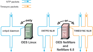 如圖 12-1 中所描繪,OES 2 NetWare (與 NetWare 6.5) 可以使用網路時間協定 (NTP) 或是 Timesync 模組以進行時間同步。這個兩個模組都可以使用 NTP 來與 OES 2 Linux 通訊。