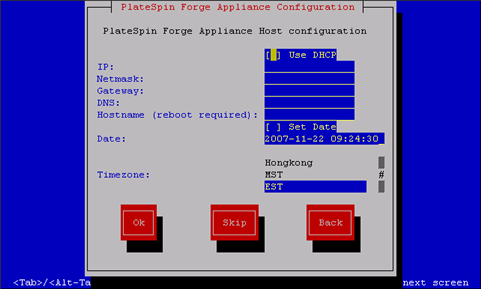 在啟始開機時,確保「PlateSpin Forge Configuration」(PlateSpin Forge 組態) 對話方塊會顯示。