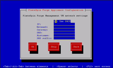 取消選取(使用 DHCP),並提供管理虛擬機器的(IP 位址)、(網路遮罩)、(閘道) 位址以及 (選擇性)(主機名稱)。此處輸入的 IP 位址用於存取 PlateSpin Forge Web 用戶端。