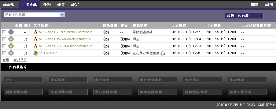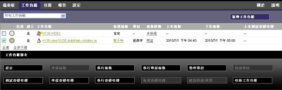 使用指令可反映工作負載保護及備援的工作流程。若要對某個工作負載執行某個指令,請選取左側相應的核取方塊。適用指令取決於工作負載的目前狀態。