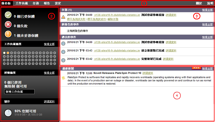 最新新聞面板︰ 透過 RSS 提供有關產品和相關更新的資訊。若要訂閱 PlateSpin Forge 新聞 feed,請按一下 。